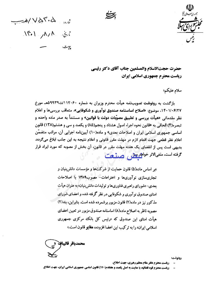 نظر رییس مجلس درخصوص تصویبنامه هیات وزیران موضوع اصلاح اساسنامه صندوق نوآوری و شکوفایی اعلام شد.