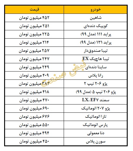قیمت خودرو صفر داخلی در لحظه نگارش این گزارش در بازار ایران به شرح زیر است: