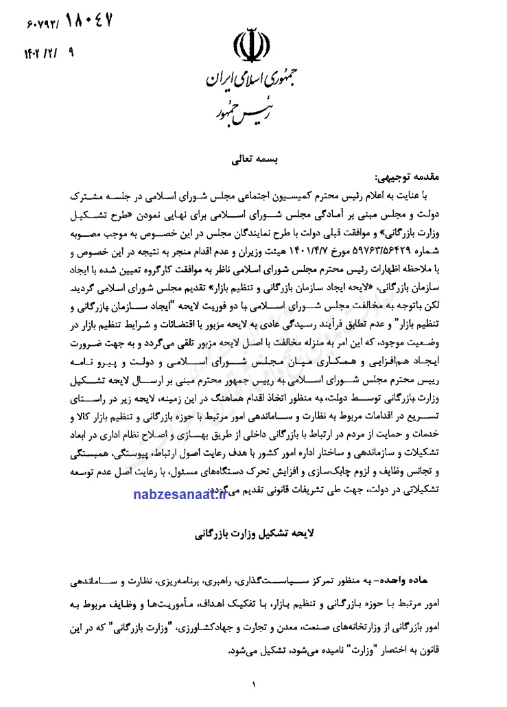 به گزارش خبرنگار پایگاه خبری نبض صنعت، لایحه تشکیل وزارت بازرگانی طی نامه شماره 18047 مورخ 1402/02/09 برای انجام تشریفات قانونی از سوی دولت به مجلس ارسال شد.