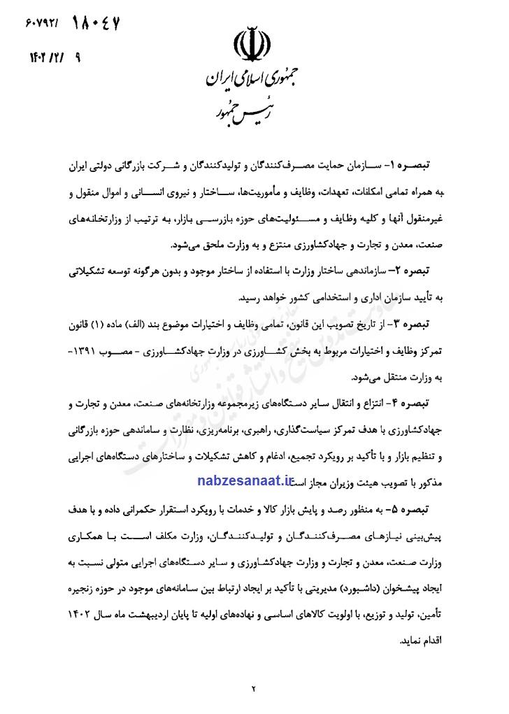 به این ترتیب همه وظایف و اختیارات از وزرای صنعت و کشاورزی گرفته شده و به وزیر بازرگانی محول می شود.
