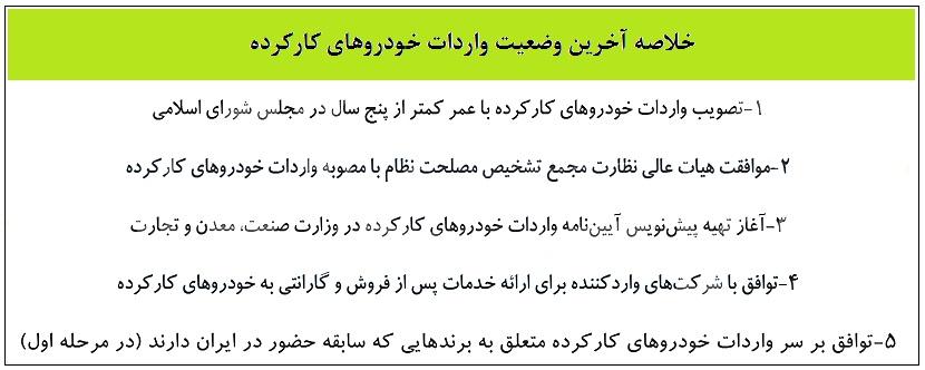 درحالحاضر، واردات خودروهای صفرکیلومتر به کشور قانونی بوده و آییننامه آن نیز در شهریور سال گذشته ابلاغ شده است. همچنین تا به امروز تعداد البته محدودی خودروی خارجی وارد گمرکات کشور شده است، هرچند البته هنوز دست هیچیک از متقاضیان به آنها نرسیده است. از آن سو واردات خودروهای دستدوم هنوز ابلاغ نشده و طبعا آییننامه آن نیز نهایی نیست. این البته در حالی است که مشکل خاصی بر سر راه ابلاغ مصوبه واردات خودروهای کارکرده وجود ندارد و تنها امور بهاصطلاح اداری آن باقی مانده است. بزرگترین مانعی که میتوانست جلوی واردات خودروهای کارکرده را (در بخش قانونی ماجرا) بگیرد، هیات عالی نظارت مجمع تشخیص مصلحت نظام بود که هفته گذشته مهر تایید خود را بر این مصوبه زد. حالا تنها مانده تایید و ابلاغ رسمی شورای نگهبان که با توجه به موضع داخلی قبلی این شورا در مورد واردات خودرو (صفرکیلومتر) به کشور، بعید است اتفاق نیفتد. بنابراین با توجه به اتفاقات رخداده، به نظر میرسد واردات خودروهای کارکرده راه بسیار کوتاهی تا ابلاغ رسمی دارد و بنابراین در آینده نزدیک، در کنار صفرکیلومترها، واردات دستدومها هم آزاد خواهد بود.