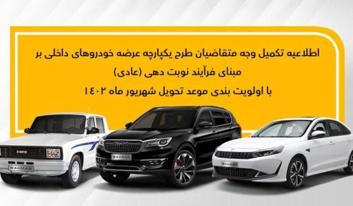 متقاضیان عادی محصولات بهمن موتور که در طرح سامانه یکپارچه نوبت آنها از سوی وزارت صمت شهریور اعلام شده است، میتوانند به صورت آنلاین از ساعت ده صبح شنبه ۳۱ تیر تا ساعت ۱۶ روز شنبه ۷مرداد ۱۴۰۲ فرآیند ثبت نام خود را کامل کنند.