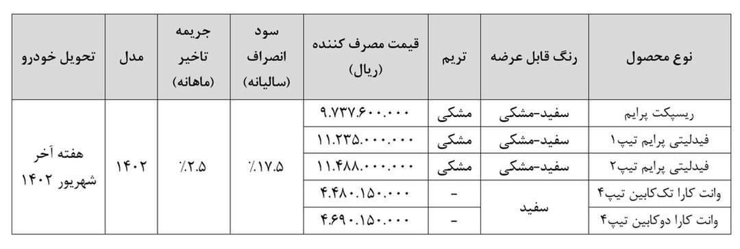 در این نوبت محصولات فیدلیتی پرایم تیپ۱ و فیدلیتی پرایم تیپ۲ و ریسپکت پرایم; و وانت تک کابین و وانت دو کابین عرضه میشود.