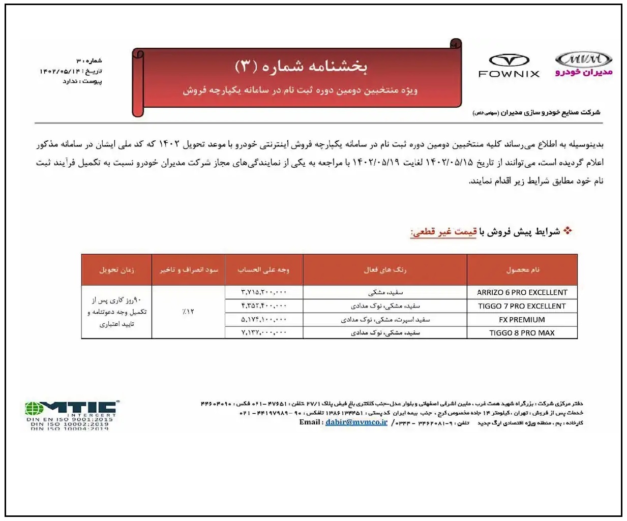 2. متقاضیان خرید خودروی تیگو ۸ پرو پریمیوم به صورت دلخواه امکان تبدیل خودرو به تیگو ۷ پرو اکسلنت ، FX پریمیوم و تیگو ۸ پرو مکس را در ابتدای ثبت نام خواهند داشت و در صورت عدم ثبت نام حق ایشان تا اطلاعیه بعدی محفوظ خواهد ماند.