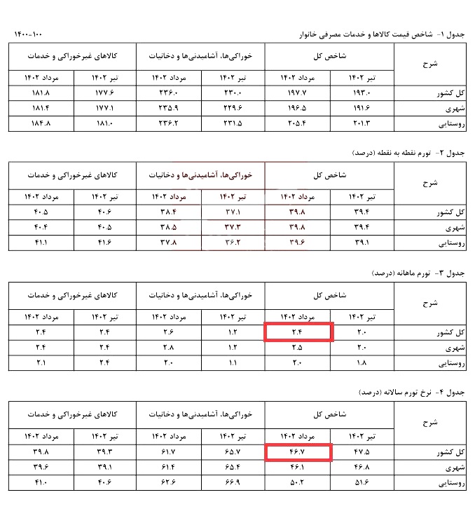 گزارش جدید مرکز آمار ایران حاکی است، نرخ تورم در مردادماه سال جاری به ۴۶.۷ درصد کاهش یافته است.