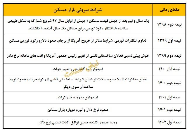 برای درک بهتر آنچه در این ۸ مقطع زمانی بازار ساخت و معاملات مسکن را تحتتاثیر قرار داده است، شرایط بیرونی و درونی بازار و افت و خیزهای مربوط به آن توضیح داده میشود.