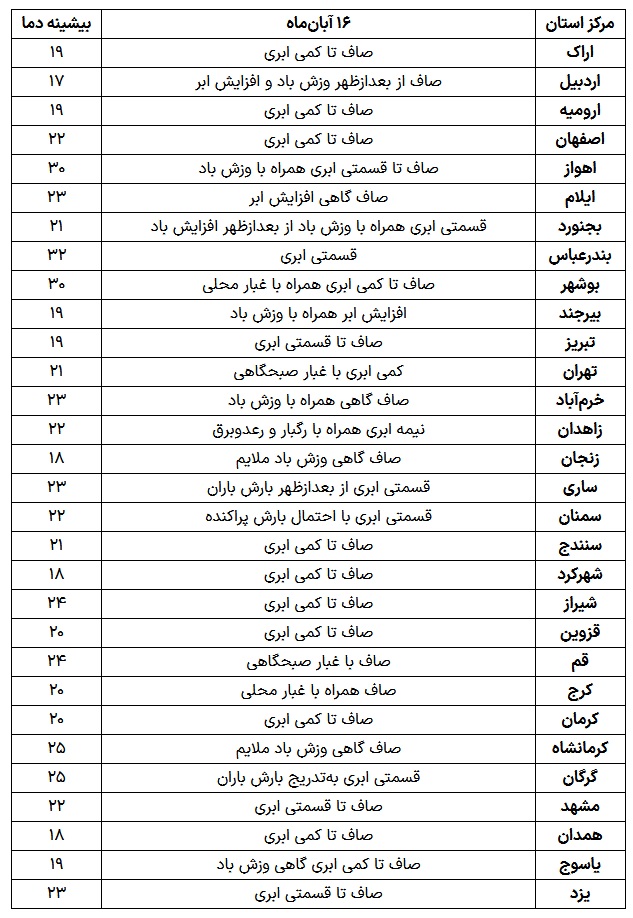 سهشنبه 1402/08/16: ارتفاعات کرمان، جنوب سیستان و بلوچستان، گیلان، شرق اردبیل، مازندران، خراسان شمالی.