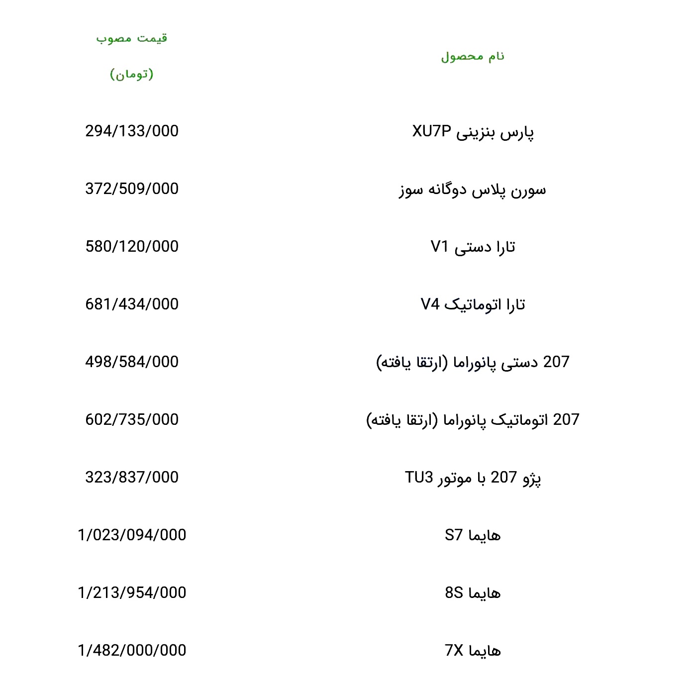 در این لیست، پارس بنزینی ۲۹۴ میلیون و ۱۳۳ هزار تومان و تارا اتوماتیک ۶۸۱ میلیون و ۴۳۴ هزار تومان قیمت خورده است.