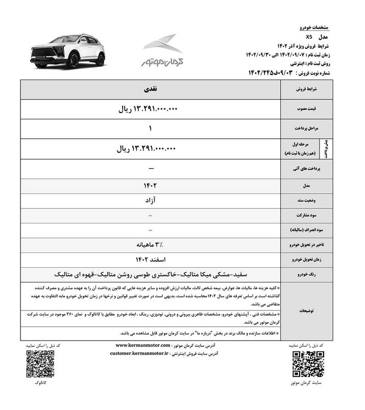 کرمان موتور شرایط فروش نقدی ویژه آذر ۱۴۰۲ برای KMC X۵ محصول جدید خود را اعلام کرد. عرضه این خودرو از طریق سامانه یکپارچه تخصیص خودرو صورت می گیرد.