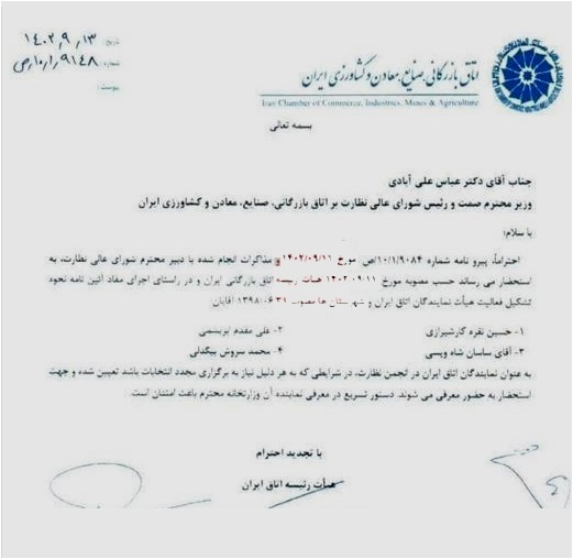 روز گذشته هم در راستای برگزاری انتخابات جدید ریاست اتاق بازرگانی ایران، هیات رئیسه اتاق بازرگانی در نامه ای به وزیر صمت رئیس شورای عالی نظارت 4 عضو انجمن نظارت بر انتخابات اتاق را معرفی کردند وخواستار معرفی نماینده دولت در این انجمن شدند.