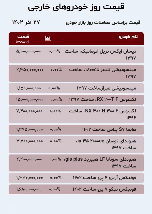 قیمت خودرو امروز دوشنبه ۲۷ آذر ۱۴۰۲ بدون تغییر نسبت به روزهای گذشته باقی مانده است. با توجه به حضور وزیر صمت در مجلس جهت پاسخگویی به سوالات نمایندگان در خصوص عدم اجرای آیین‌نامه واردات خودروهای کارکرده و صفر کیلومتر به کشور، می‌توان انتظار ثبات قیمت و پایداری رکود در بازار خودرو را تا پیش از جلسه علنی مجلس متصور بود.