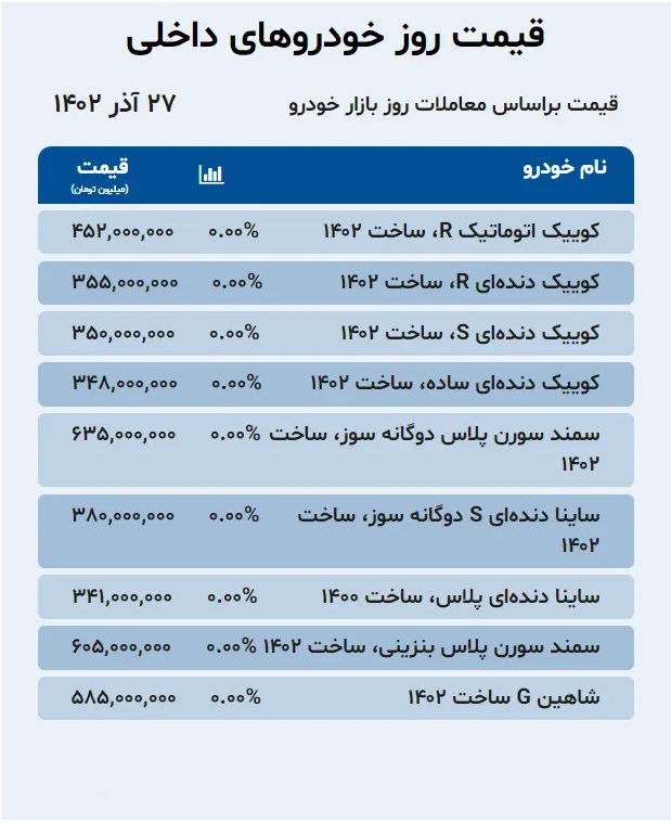 قیمت خودروهای داخلی بدون هیچ تغییری نسبت به روزهای پایانی هفته گذشته باقی مانده‌ و از آن تاریخ تا کنون هیچ‌گونه نوسان قیمتی را بازار خودرو به خود ندیده است. برای مثال در گروه خودروسازی سایپا، شاهین G با ۵۸۵ میلیون تومان، کوییک R دنده‌ای با ۳۵۵ میلیون تومان، ساینا S دوگانه سوز با ۳۸۰ میلیون تومان و کوییک R دنده اتوماتیک با ۴۵۲ میلیون تومان در بازار همانند روزهای پیشین در بازار ارزش گذاری می‌شوند.
