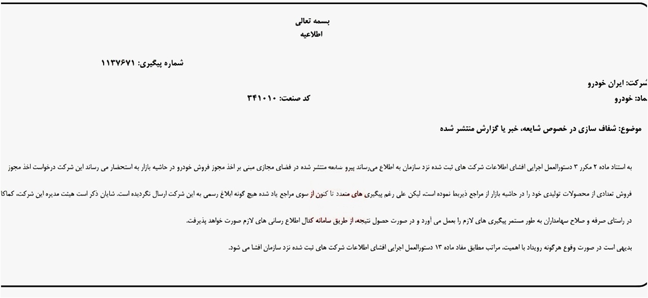 به گزارش نبض صنعت، شرکت ایران خودرو در اطلاعیه ای اعلام کرد: پیرو شایعه منتشر شده در فضای مجازی مبنی بر اخذ مجوز فروش خودرو در حاشیه بازار به استحضار می رساند این شرکت درخواست اخذ مجوز فروش تعدادی از محصولات تولیدی خود را در حاشیه بازار از مراجع ذیربط نموده است، لیکن علی رغم پیگیری های متعدد تا کنون از سوی مراجع یاد شده هیچ گونه ابلاغ رسمی به این شرکت ارسال نگردیده است.
