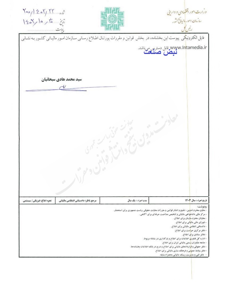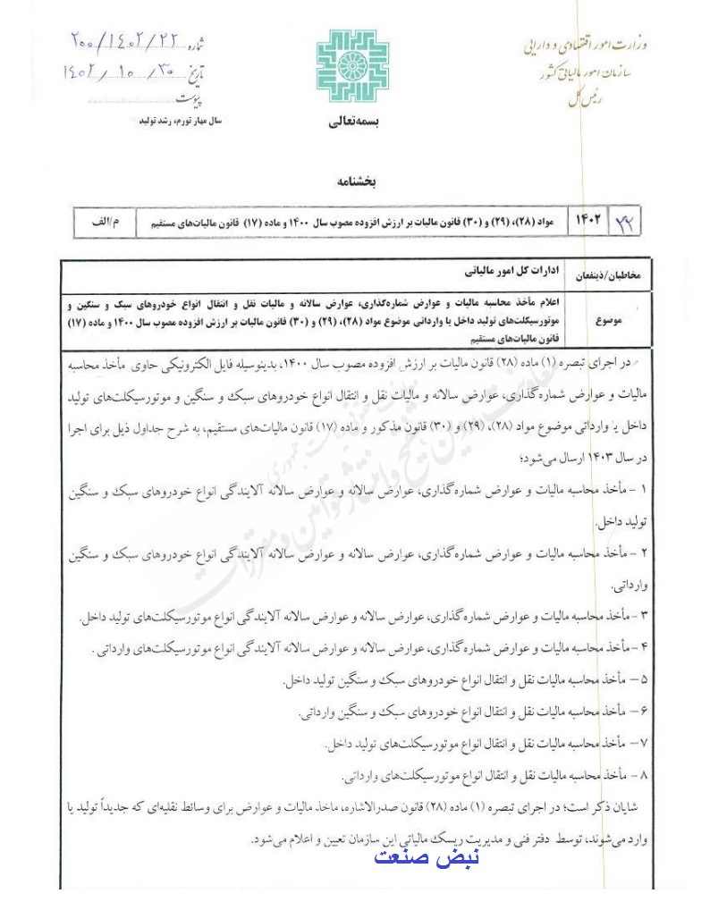 متن بخشنامه ماخذ محاسبه مالیات و عوارض پلاک گذاری خودروها برای سال 1403 به شرح زیر است:
