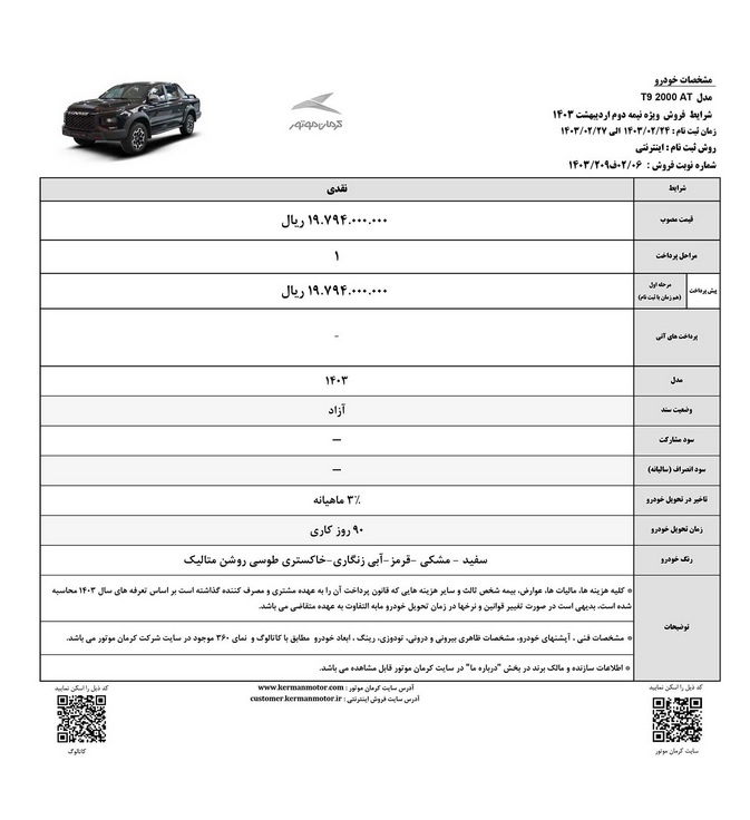 شرکت کرمان موتور شرایط فروش اقساطی کی ام سی X۵ و شرایط فروش نقدی پیکاپ T۹ را اعلام کرد.