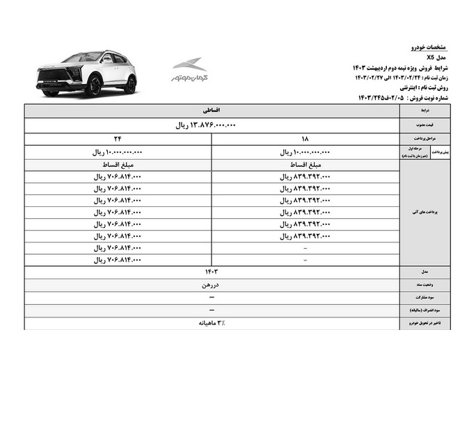 همچنین کی ام سی X۵ با قیمت قطعی یک میلیارد و ۳۸۷ میلیون تومان به صورت اقساط ۱۸ و ۲۴ ماهه از سوی این شرکت عرضه می شود.