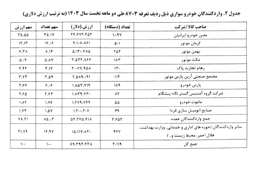 همچنین کرمان موتور با ۵۰۱ دستگاه، بهمن موتور با ۲۵۴ دستگاه و مکث موتور با ۱۸۳ دستگاه خودرو، در جایگاه های دوم تا چهارم بیشترین واردات خودرو قرار دارند.
