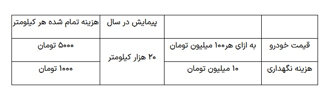 - قیمت خودرو: برای این کار قیمت خودروهای صفر را مدنظر قرار دهید. برای مقایسه ساده تر فرض کنید عمر مفید خودرو همان یکسال اول است.