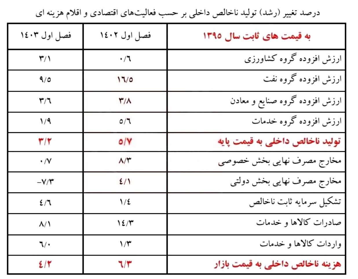 در گزارش بانک مرکزی آمده است: بر اساس محاسبات مقدماتی اداره حساب های اقتصادی این بانک، تولید ناخالص داخلی به قیمت پایه (به قیمت های ثابت سال ۱۳۹۵) در سه ماهه اول سال ۱۴۰۳ به رقم ۳۹۰۵.۱ هزار میلیارد ریال رسید که نسبت به فصل اول سال ۱۴۰۲، رشد ۳.۲ درصدی را نشان میدهد. رشد اقتصادی بدون نفت نیز طی دوره زمانی مذکور معادل ۲.۵ درصد بوده است. همچنین بر اساس محاسبات مخارج نهایی، نرخ رشد هزینه ناخالص داخلی به قیمت بازار طی فصل اول سال ۱۴۰۳ نسبت به دوره مشابه سال قبل از آن معادل ۴.۲ درصد برآورد گردیده است.
