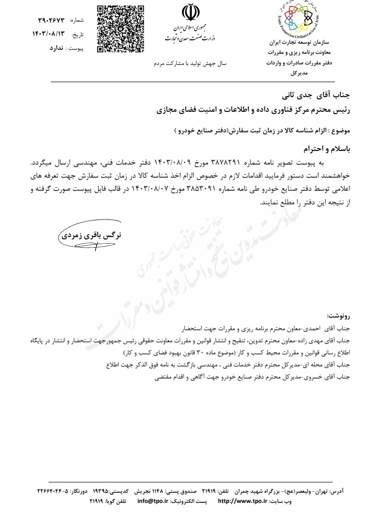 بخشنامه سازمان توسعه تجارت ایران با موضوع الزام اخذ شناسه کالا در زمان ثبت سفارش (دفتر صنایع خودرو) ابلاغ شد.