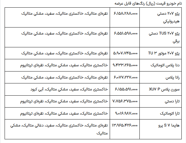 در این طرح، مدلهای زیر با قیمتهای مشخص و رنگهای متنوع عرضه میشوند: