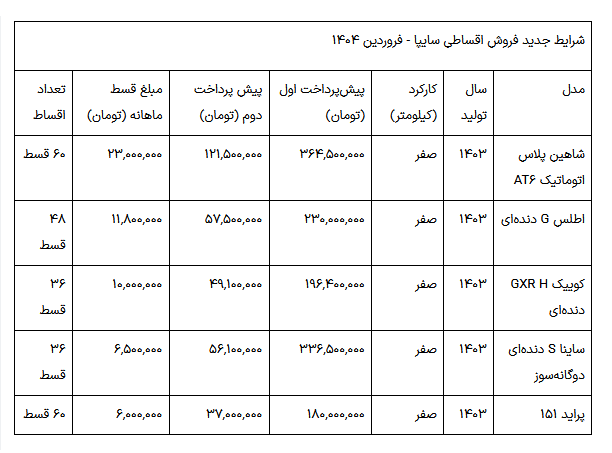 شرایط جدید خرید اقساطی محصولات سایپا در فروردین ۱۴۰۴ اعلام شد؛ از شاهین پلاس اتوماتیک تا ساینا S دوگانه‌سوز، خودروهای متنوع سایپا با پیش‌پرداخت‌های مرحله‌ای و اقساط بلندمدت در دسترس خریداران قرار گرفته‌اند.
