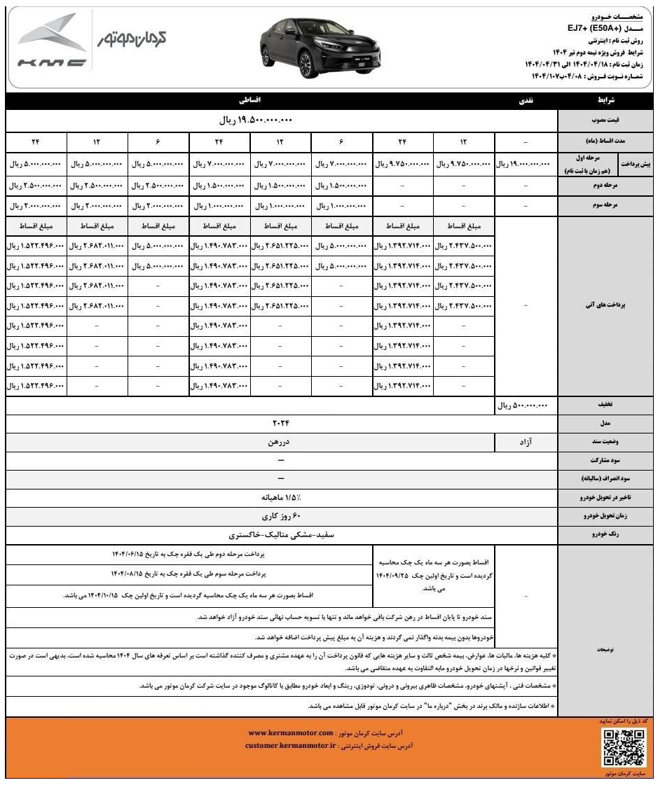 شرکت کرمان موتور در طرح فروش ویژه نیمه دوم تیرماه، شرایط فروش جدیدی را برای سدان برقی KMC EJ۷+ ارائه کرده است. در این طرح، متقاضیان میتوانند با پیش پرداختها و اقساط متنوع، این خودرو را به صورت پرداخت مرحلهای خریداری کنند. ثبتنام از تاریخ ۱۸ تیر تا ۳۱ تیر ۱۴۰۴ بهصورت اینترنتی انجام میشود.