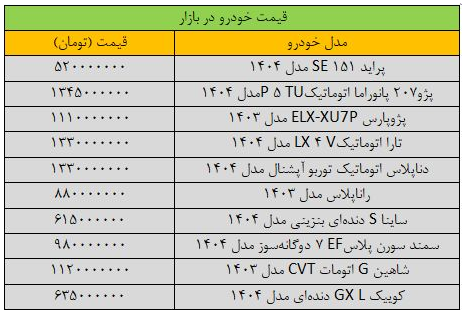 بنا به این گزارش، تارا اتوماتیک V۴ LX مدل ۱۴۰۴ در بازار خودرو یک میلیارد و ۳۳۰ میلیون تومان قیمت خورد. قیمت تارا اتوماتیک V۲ مدل ۱۴۰۳ نیز به یک میلیارد و ۲۰۰ میلیون تومان رسید.