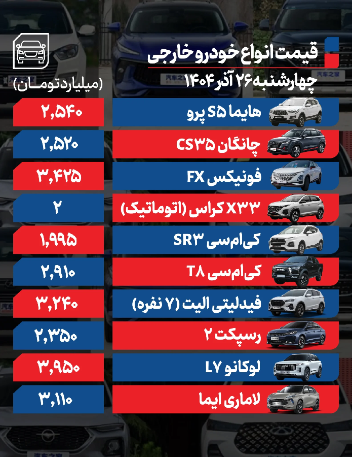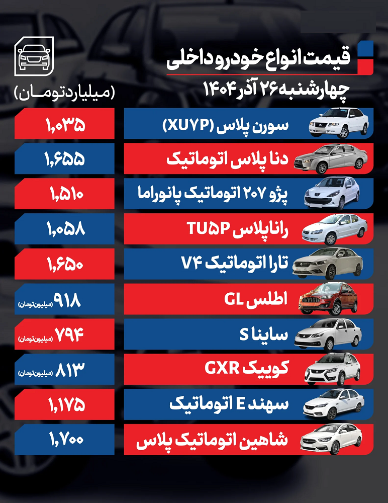 قیمت خودرو امروز ۲۶ آذر ۱۴۰۴ از سوی بنگاههای معاملاتی اعلام شد.