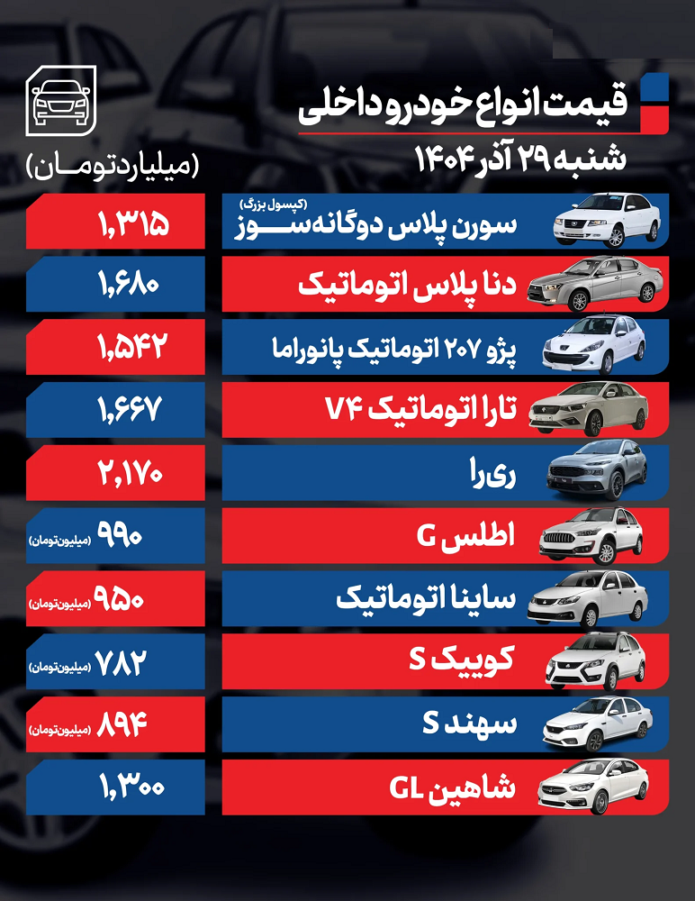 قیمت خودرو امروز ۲۹ آذر ۱۴۰۴ از سوی بنگاههای معاملاتی اعلام شد.