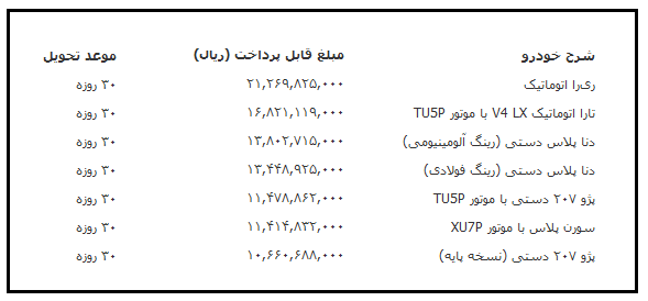 - تحویل خودروها حداکثر ظرف ۳۰ روز پس از تکمیل وجه صورت میگیرد.